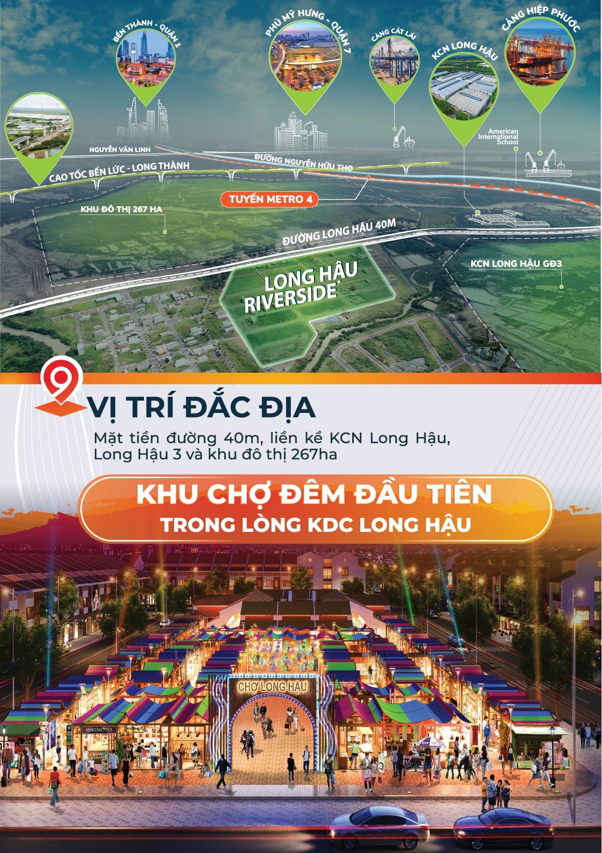 Long Hậu Riverside Dự án nằm ngay khu công nghiệp Long Hậu và đối diện T&T Long Hậu chủ đầu tư T&T Group. Dự án có diện tích phân lô từ 90 đến 200m2 có mặt tiền từ 4,5m đến 10m (sở hữu Sổ đỏ lâu dài). Sau 2 tháng mở bán Giai đoạn 1 dự án Long Hau Riverside thì Tháng 10/2018, chúng tôi chính thức mở bán Giai đoạn 2 với khu đất liền kề Phố Chợ Long Hậu Riverside Market.
