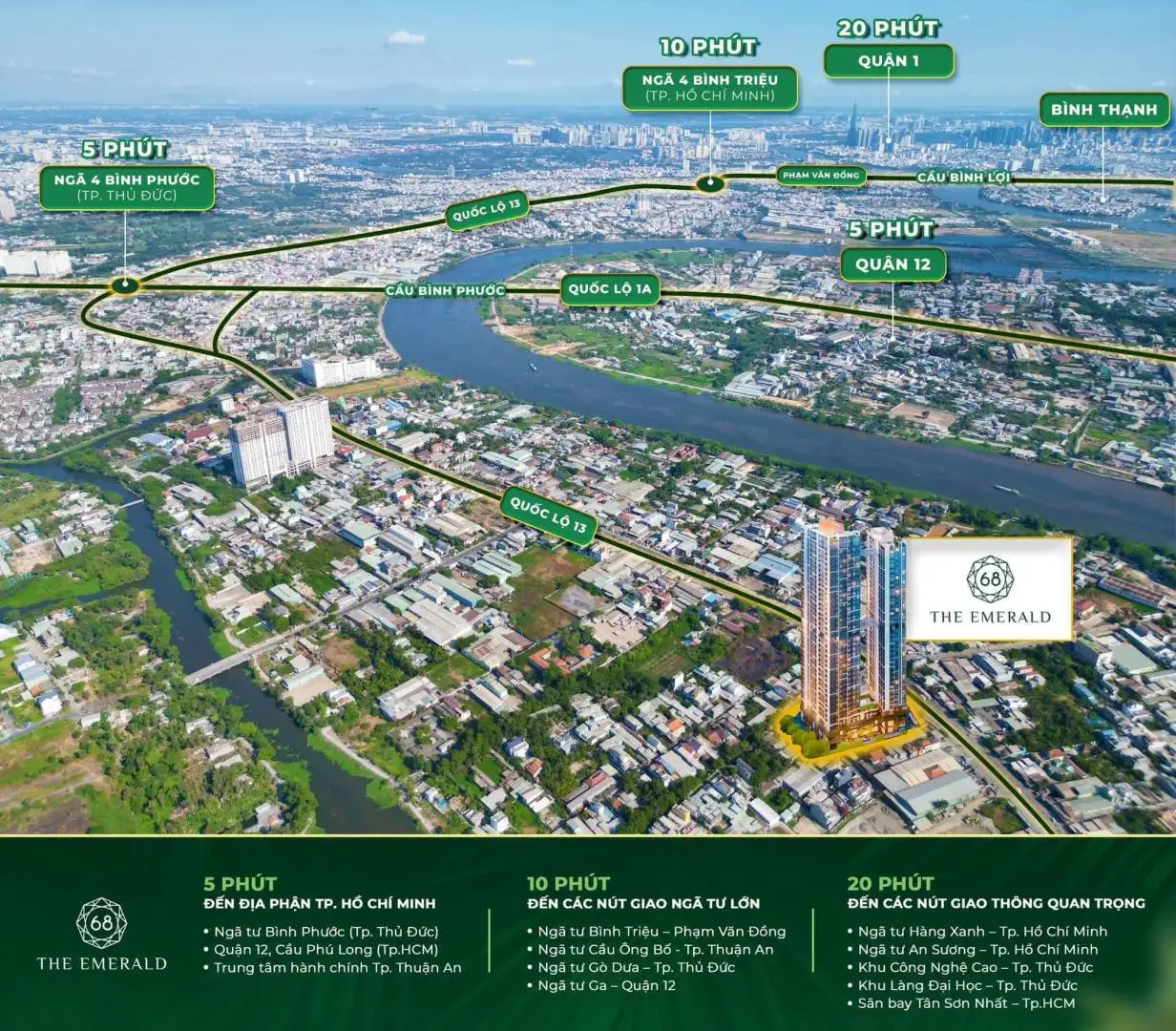 Dự án The Emerald 68 là dự án căn hộ toạc lạc trên mặt tiền QL 13 thuộc phường Vĩnh Phú Thành Phố Thuận An, Bình Dương ( Cách Thành Phố Thủ Đức, Gigamall Phạm Văn Đồng chỉ 5 phút đi xe ). Đây là một trong những dự án cực kỳ tiềm năng khi sở hữu vị trí đắc địa, hệ thống hạ tầng hoành tráng và những tiện ích thực dụng nhất để phục vụ cư dân.