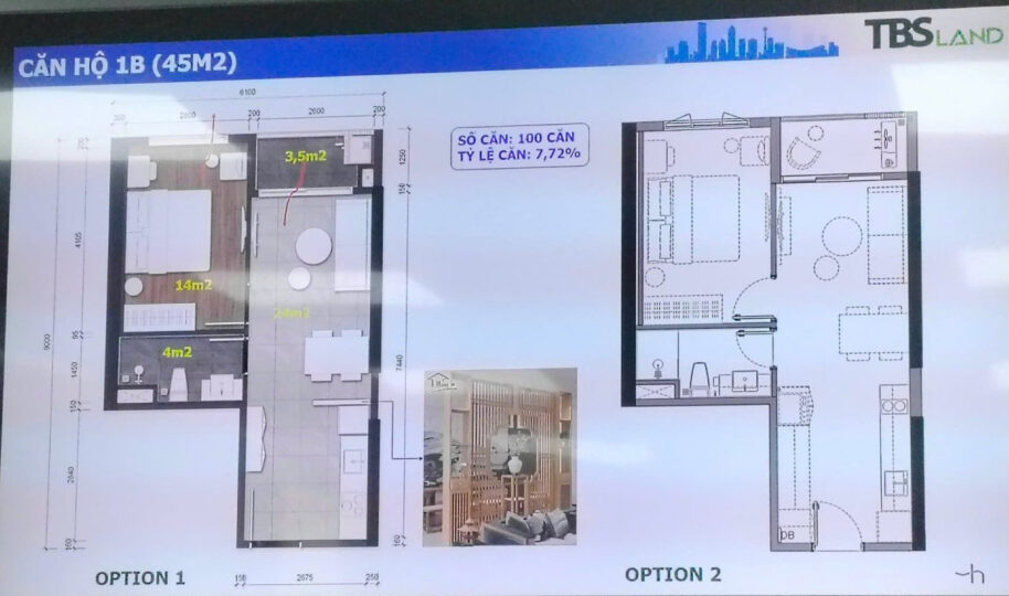 - 1PN (45–55 m²): Phù hợp người trẻ, chuyên gia độc thân hoặc cặp vợ chồng mới cưới.