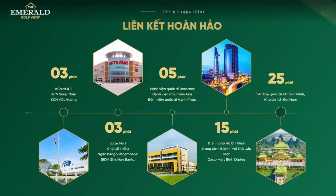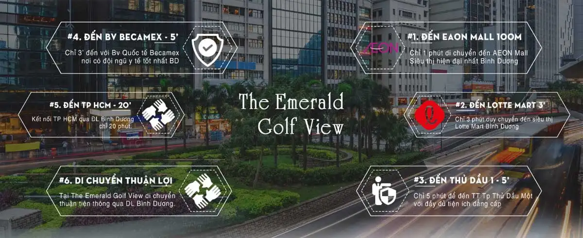 The Emerald Golf View sở hữu vị trí vàng đáng mơ ước, khi nằm tại mặt tiền Đại Lộ Bình Dương. Từ dự án, các cư dân có thể ngắm nhìn sân golf sông Bé rộng lớn từ trên cao. Từ dự án quý cư dân có thể di chuyển đến các trung tâm, đô thị khác như: