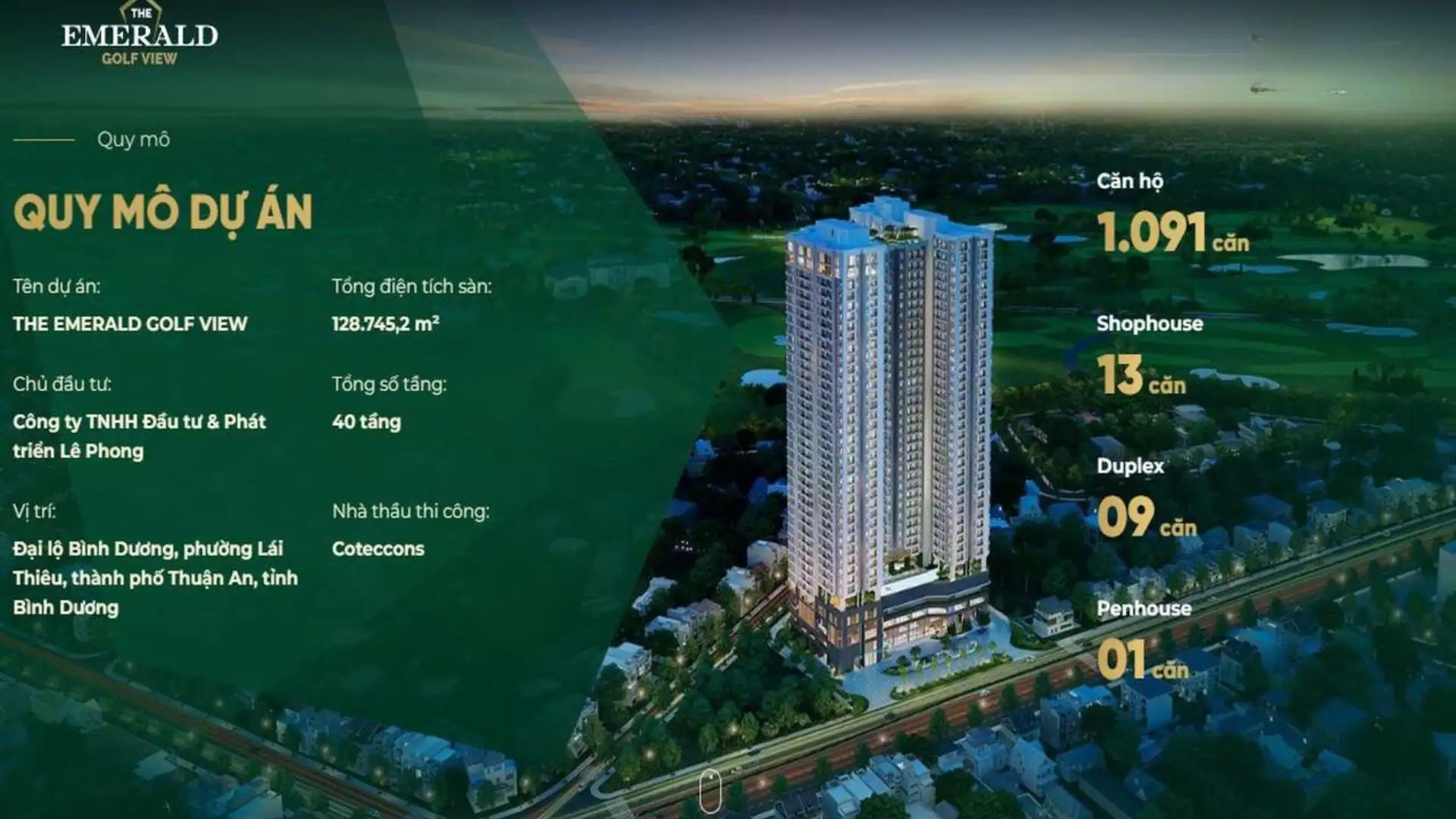 The Emerald Golf View là dự án chiến lược do Công Ty TNHH Đầu Tư & Phát Triển Lê Phong đầu tư và phát triển. Dự án với mức vốn đầu tư lên đến 5800 tỷ đồng và sở hữu quy mô lên đến 8.627 m2. Hơn thế nữa dự án còn sở hữu vị trí đắc địa khi nằm trên mặt tiền đại lộ Bình Dương. Với tầm nhìn sân golf triệu đô, dự án được dự đoán mở ra tiềm năng phát triển cho thị trường bất động sản Bình Dương cũng như phía Đông Tphcm.