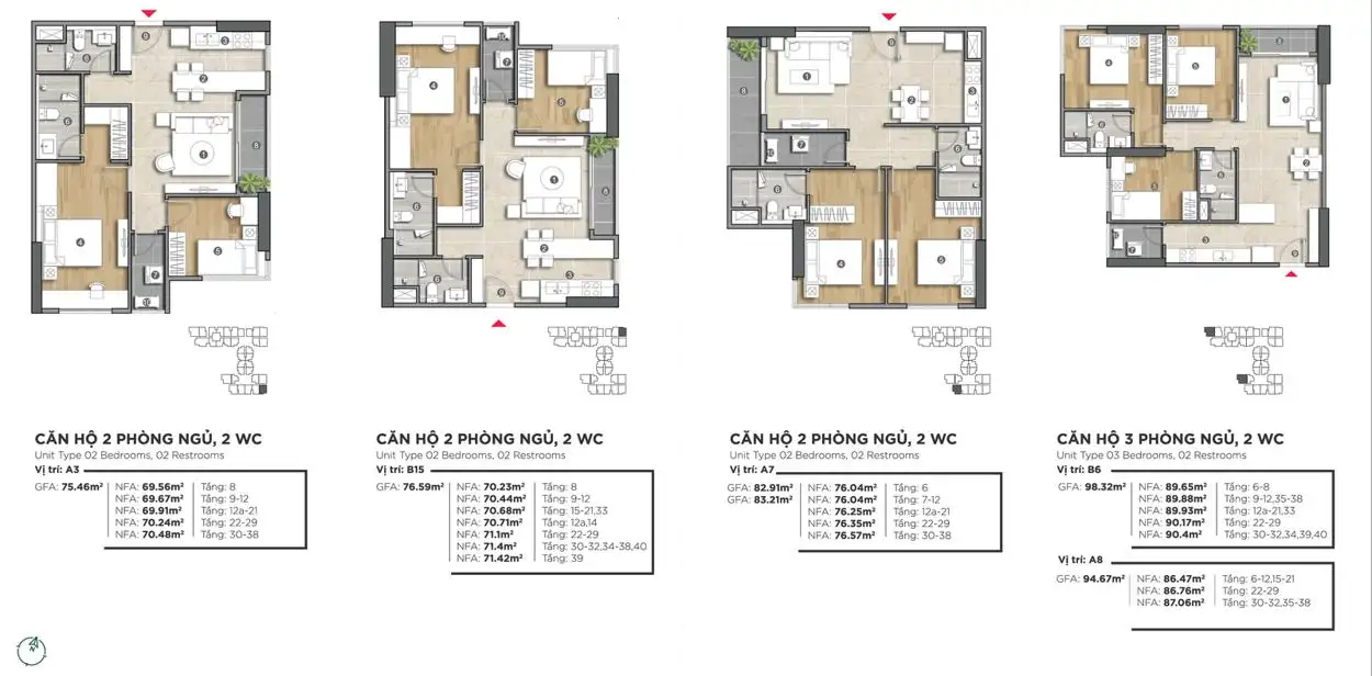 | 63m2 – 66m2 – 72m2 – 75m2 – 83m2 | 2 phòng ngủ – 2 WC | 2.5 tỷ – 3.3 tỷ | 2.7 tỷ – 3.6 tỷ |