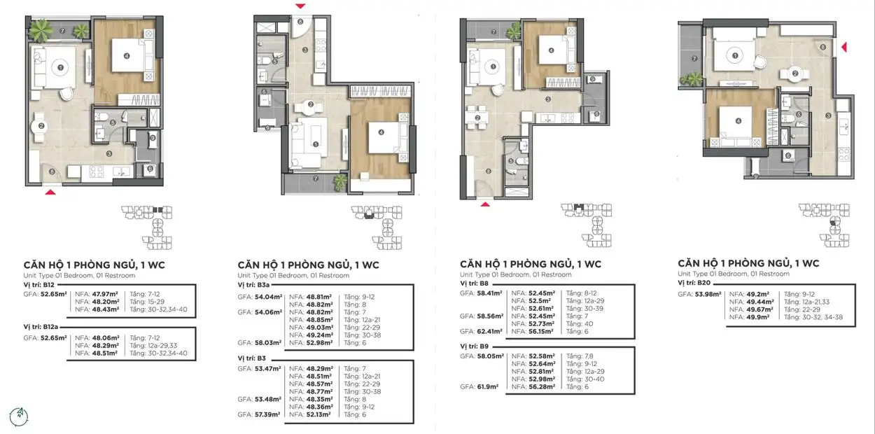| 50m2 – 52m2 – 53m2 – 54m2 – 58m2 | 1 phòng ngủ – 1 WC | 1.9 tỷ – 2,2 tỷ | 2,1 – 2,4 tỷ |