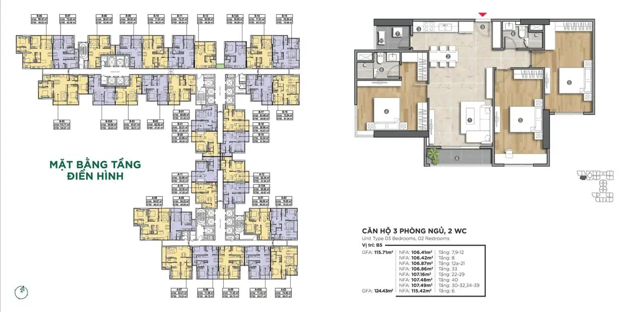 - Tầng 7 – 38: Căn hộ 1 – 3 phòng ngủ