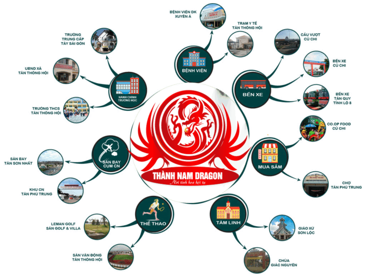 Dự án khu đô thị sinh thái Thành Nam Dragon từ điện, đường, trường, trạm, không thiếu bất cứ tiện ích nào: Cách sân bay Tân Sơn Nhất chỉ 13km khoảng 20 Phút đi xe; Cụm Công nghiệp Tân Phúc Trung (500m); Siêu thị Coop Food Củ Chi (4.2km); Chợ Tân Phú Trung (3.8km); UBND Xã Tân Thông Hội (3km); Chùa Giác Nguyên (1.1km); Leman Golf – Sân Golf – Khu Villa (3.5km); Trạm Y tế Tân Thông Hội (3km); Giáo xứ Sơn Lộc – Củ Chi (3km); Trại Bò sữa Củ Chi (4.2km); Trường THCS Tân Thông Hội (4km); Cầu vượt Củ Chi (8.6km); Bệnh Viện Đa Khoa Xuyên Á (4km); …